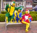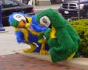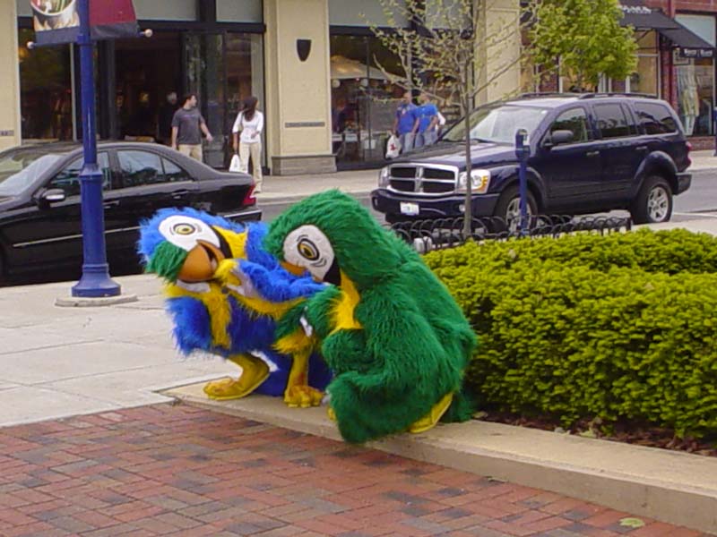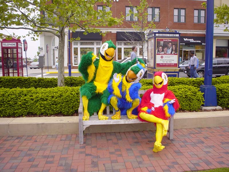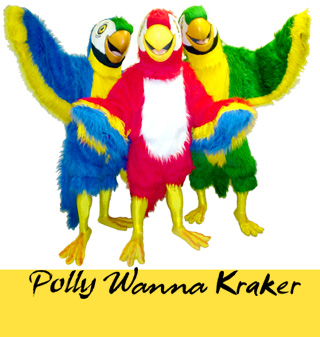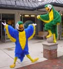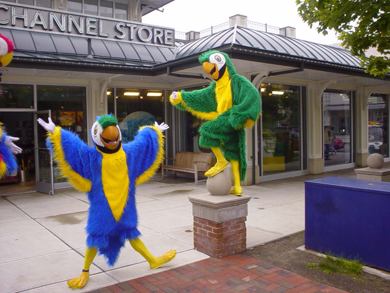 This is a turnkey mascot performance that is ideal for any summer or spring event where bright colors and energetic interaction with gusts is appropriate. The parrot costumes are very colorful, friendly looking, and inviting. The characters stroll around a venue, interact with guests, pose for pictures and perform small impromptu acts similar to street performers. The three always appear in a group and are accompanied by a guide in safari style attire who is "the bird watcher". His primary job is to watch the characters, ensure guests have a positive safe experience, and be the odd man in the impromptu routines. Skits include the hokey pokey, chicken dance, a whistling chorus of "Don't worry be happy" Parrot speak and many more. |